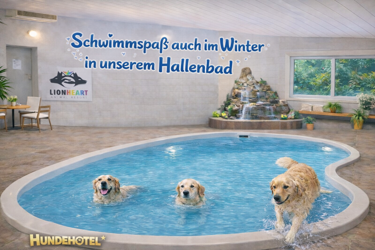 In unserem Hause ermöglichen wir Hundeschwimmen das ganze Jahr über. Im Winter steht unser beheiztes Hallenbad zur Verfügung, und im Sommer kann Ihr Hund das erfrischende Wasser in unserem BioTop genießen.